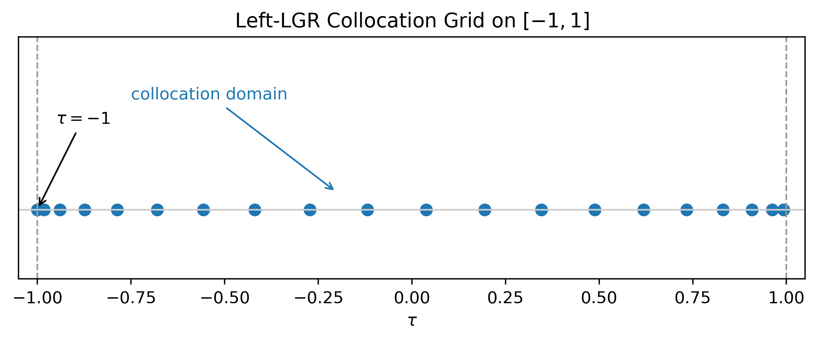 Our dynamics are continuous in time. To make the problem computable, we discretize by picking a finite set of times (collocation points), enforce the physics only at those points, and interpolate between them with a Lagrange polynomial built on our chosen nodes. We’ll use Left Legendre–Gauss–Radau (LGR) points on . “Left” means we include the left endpoint as a collocation node (good because the initial state is known), and fill the interior with special nodes from orthogonal polynomial theory.