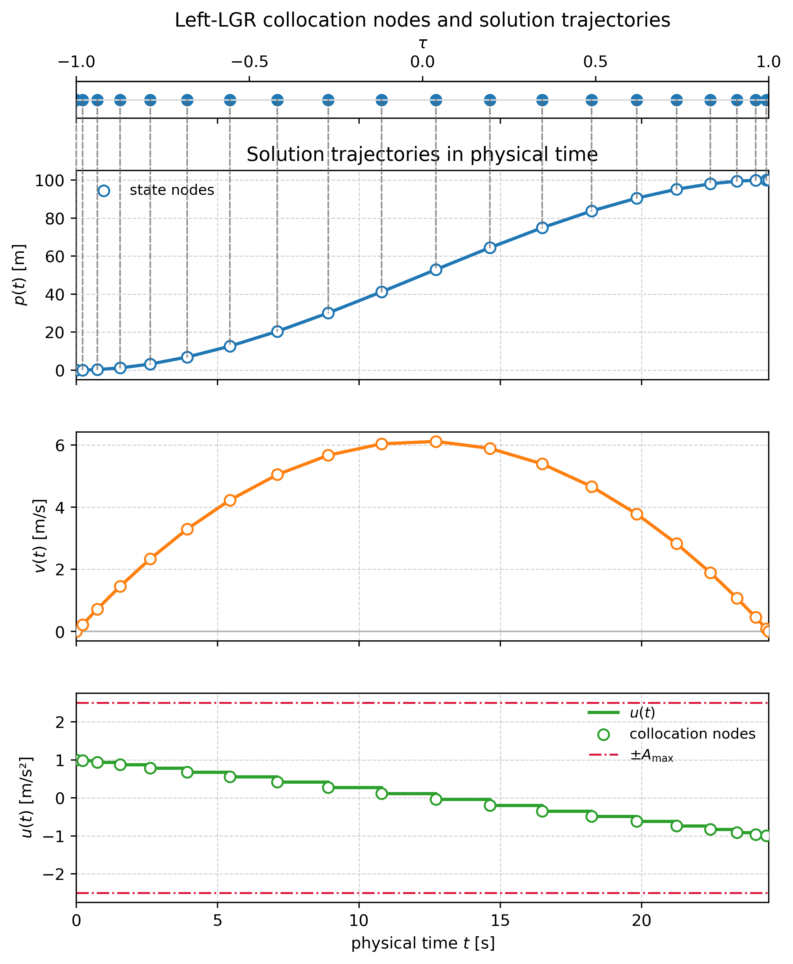 This article shows how to implement Legendre–Gauss–Radau (LGR) pseudospectral collocation in CasADi (Andersson, J. A. E., Gillis, J., Horn, G., et al. (2019)), focusing on the p-method (single interval, raise polynomial degree). The goal is to make the mapping between theory and code explicit. We’ll use a small double-integrator example to set the foundation.